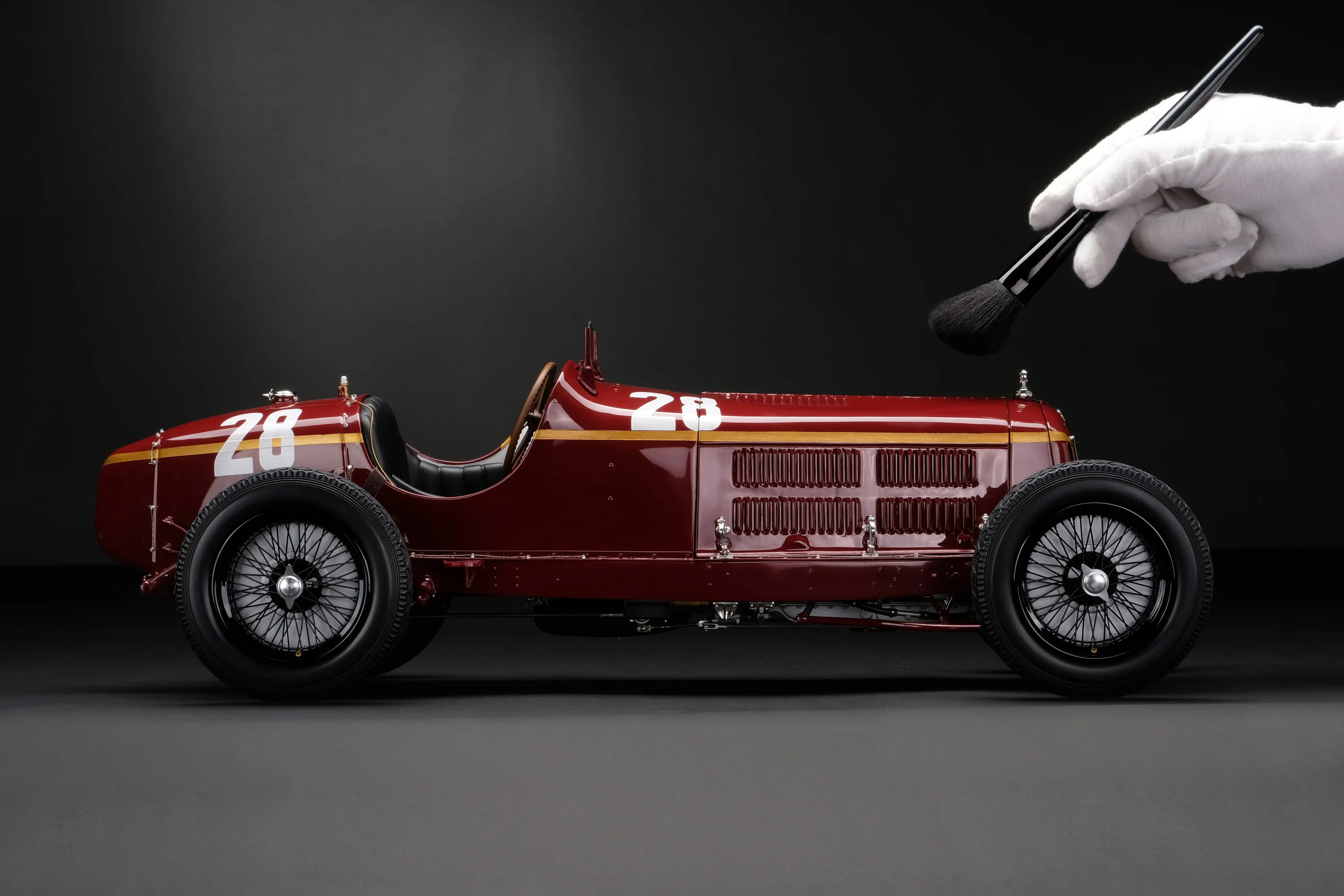 This fine 1:8 scale model is of the Alfa Romeo 8C 2300 as raced to victory by Tazio Nuvolari at the 1932 Monaco Grand Prix on the 17th of April 1932. It was the fourth running of the event, which had already gained international fame, and Alfa Romeo’s first appearance as a works team in Monaco, where they faced the teams from Bugatti and Maserati. Racing for the outfit from Portello, all in red Monzas, were the Italian trio of Nuvolari, Giuseppe Campari and Mario Umberto Borzacchini. There was a fourth car, a white Monza, for the German Rudolf Caracciola, who was not yet part of the official factory team.