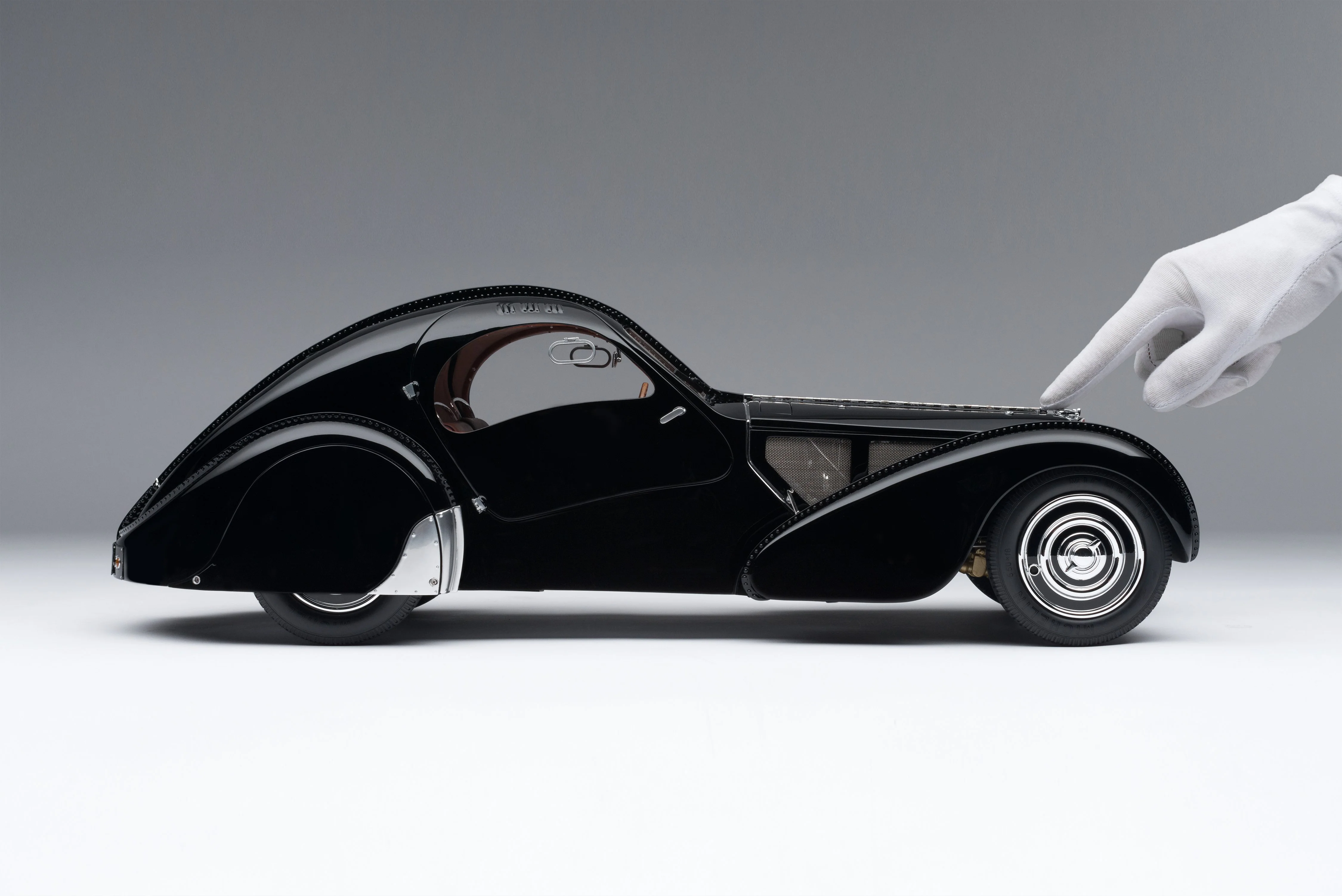 To create ‘La Voiture Noire’, we used our supremely accurate digital scanning on R.B. Pope’s model, kindly allowed by its current owner Ralph Lauren, and, with the cooperation of Bugatti's automotive historian Julius Kruta, developed this stunningly detailed and precise replica at scale. Using archived images and 3D data acquired from one of only two confirmed surviving examples of the 57SC Atlantic, this is without doubt the best reference to chassis number 57453 in existence. This fine scale model has been handcrafted and finished in our workshops with the co-operation and assistance of the manufacturer regarding original finishes, materials, archive imagery and drawings. Furthermore, the prototype model has undergone detailed scrutiny by the manufacturer’s engineering and design teams to ensure complete accuracy of representation.