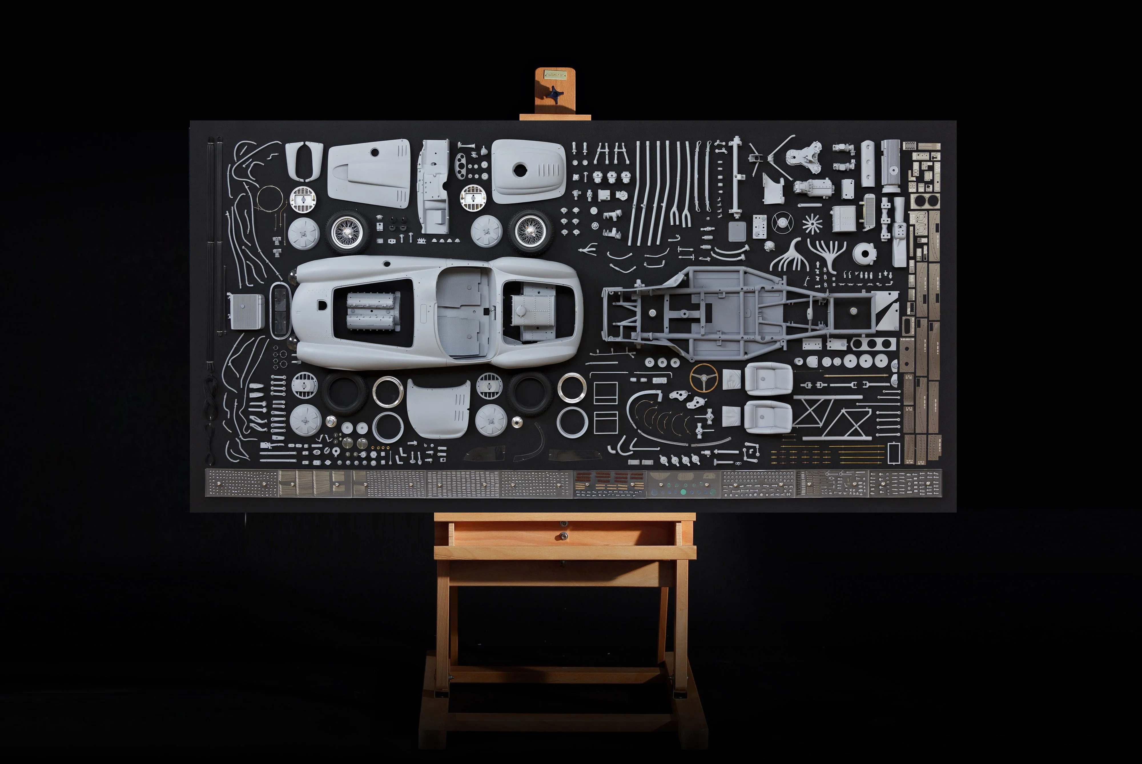 A beautiful display showing the thousands of parts of the Amalgam Ferrari 375 Plus model at 1:8 individually wired to a black Alcantara covered panel. Dimensions: 1360mm x 680mm