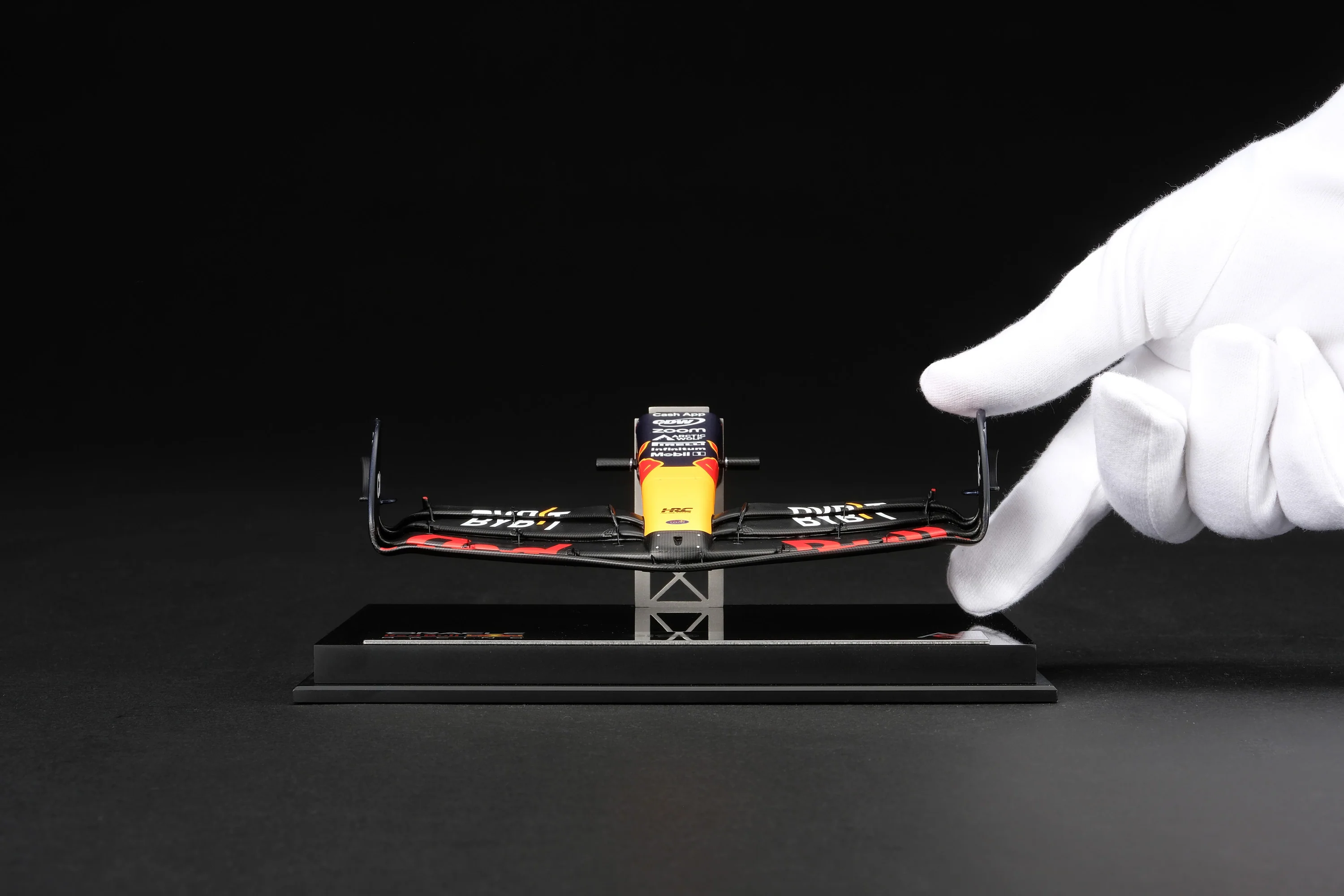 This fine 1:12 scale model of the Oracle Red Bull Racing RB19 Nosecone, as raced by Max Verstappen and Sergio Pérez during the 2023 FIA Formula One World Championship season, has been handcrafted and finished in our workshops utilising the original CAD data, finishes and paint codes supplied directly by Oracle Red Bull Racing. The completed prototype has undergone detailed scrutiny at the hands of the Oracle Red Bull Racing’s design and engineering departments to ensure complete accuracy of representation.